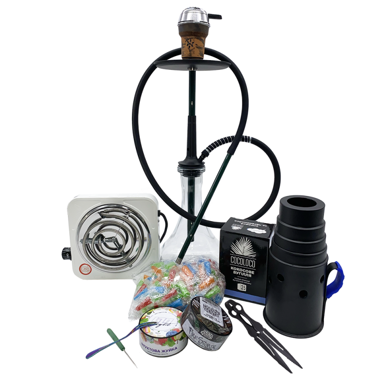 У набір входять: Кальян Tiaga Galaxy Iris (Колір на вибір, базовий комплект) Колба для кальяну Drop Прозора (Розмір M, шовна) Силіконовий шланг для кальяну Soft Touch Black (Чорний) Одноразові мундштуки для кальяну (Різнокольорові, конус з бортиком) Стабілізатор жару Калауд (Металік) Пружина для силіконового шланга для кальяну Електроплита, електропіч для вугілля 1000W White (1 конфорка) Вилка металева для тютюну Chameleon (Хамелеон) Шило для фольги для кальяну пластикова ручка (Зелений) Ковпак для кальяну Лесенка (Великий, Чорний) Кокосове вугілля для кальяну Cocoloco (1 кг, 72 шт, р25) Глиняна чаша Solaris Pluto (Коричнева глина) Тютюн Unity Pink Stoner (Пінк Стонер, 100 г) Тютюн 420 Light Фруктова жуйка (100 г)
