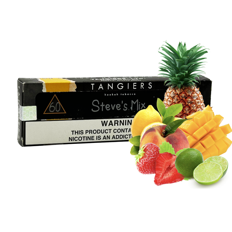 Пориньте в унікальне поєднання смаку Ананас, Полуниця, Лайм, Лимон, Манго, Персик, яке залишає незабутній післясмак і робить кожне куріння особливо приємним. Тютюн Tangiers Noir №60 Steve`s Mix (Стівіс Мікс, 250 г) Чорна упаковка пропонує глибокі та яскраві нотки, що робить його кращим вибором для курців, які шукають нові смакові відчуття.